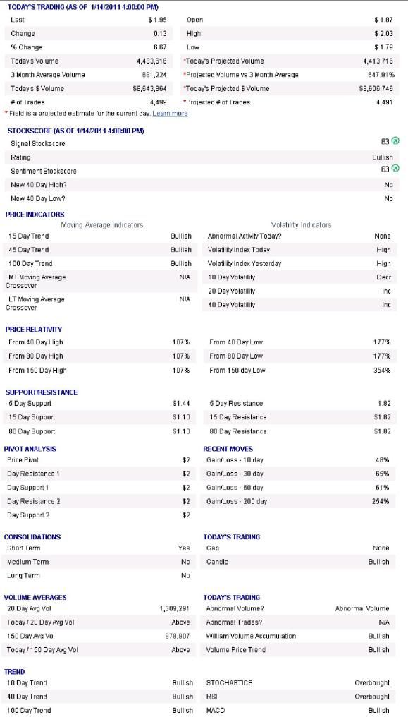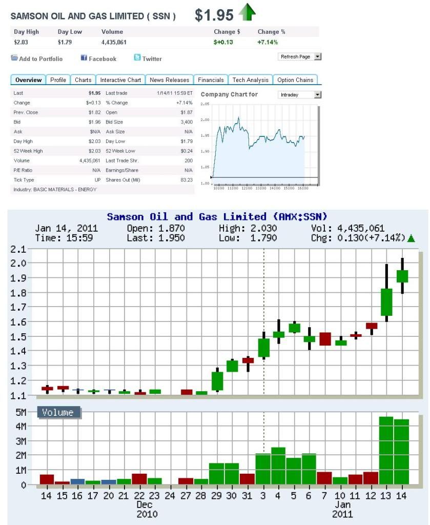 Samson Oil & Gas Limited (SSN) - SSN finally broke up into the $2's. SSN does not have any major resistance right now (意思是說一飛沖天都有可能). Pullbacks below $1.60 are a buy. (Hit a new 52 week high Friday)