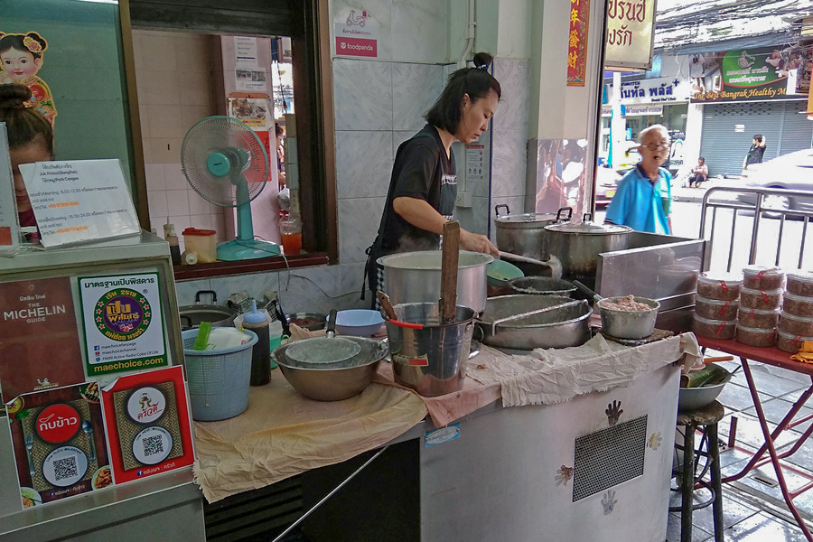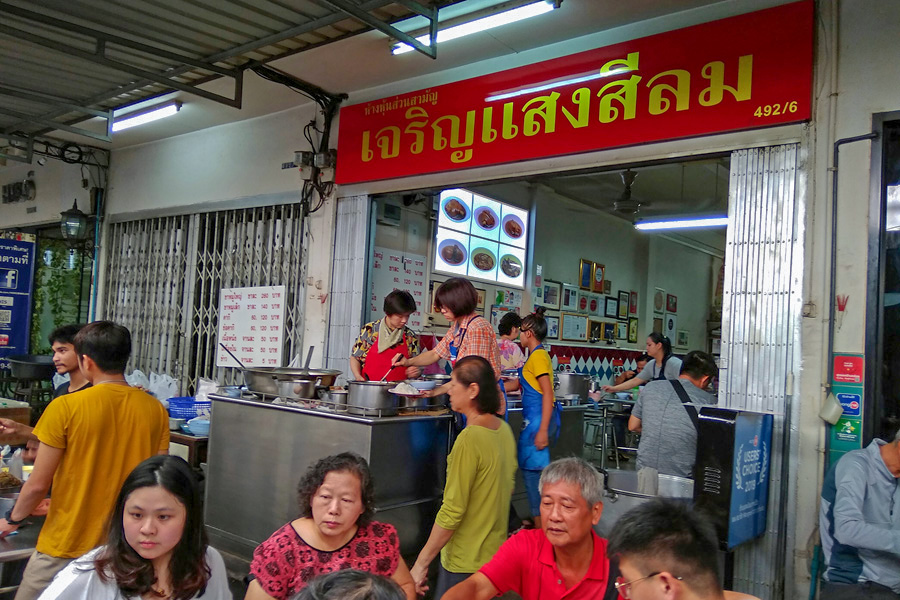 来曼谷要找出名的道地美食就要来石龙军路Charoen krung,这里的美食连CNN都有报导过,当中包括了今天要去吃的王子戏院猪肉粥与Charoen Saeng Silom猪脚饭。从酒店附近的BTS Krung Thonburi上车一站后就到BTS Saphan Taksin了。从3号出口走到十字路口那就是石龙军路了。再顺着大路走去看到Robinson这地标,就可找到各种美食。王子戏院猪肉粥近在咫尺,但是已经不是巷子而是在店里营业了。