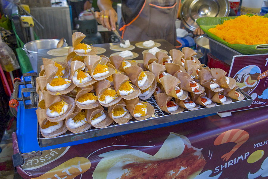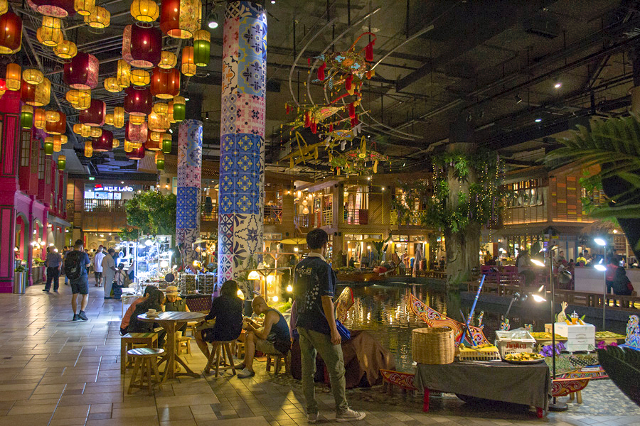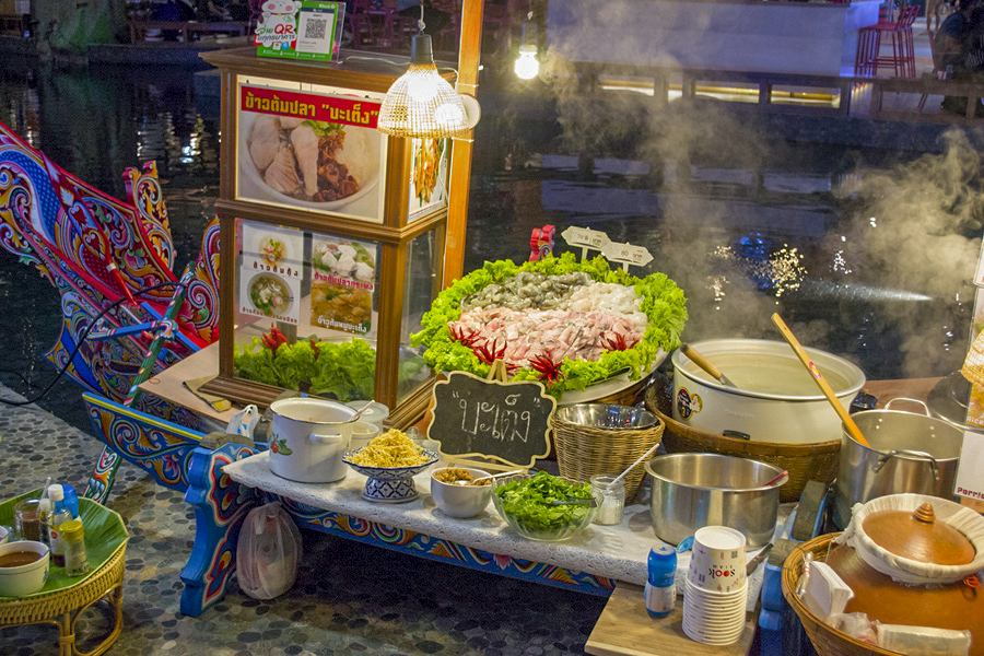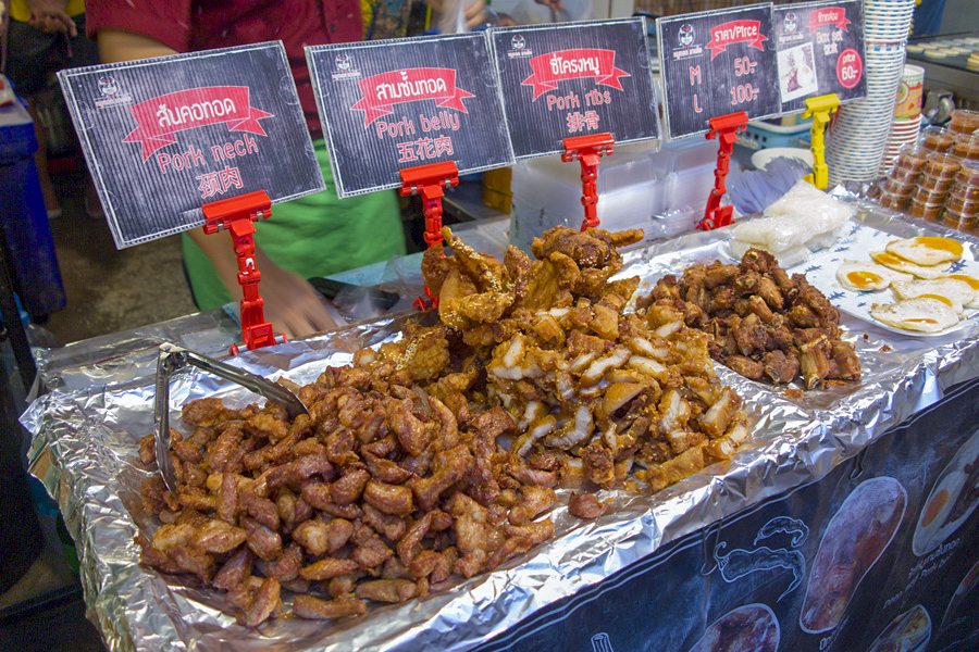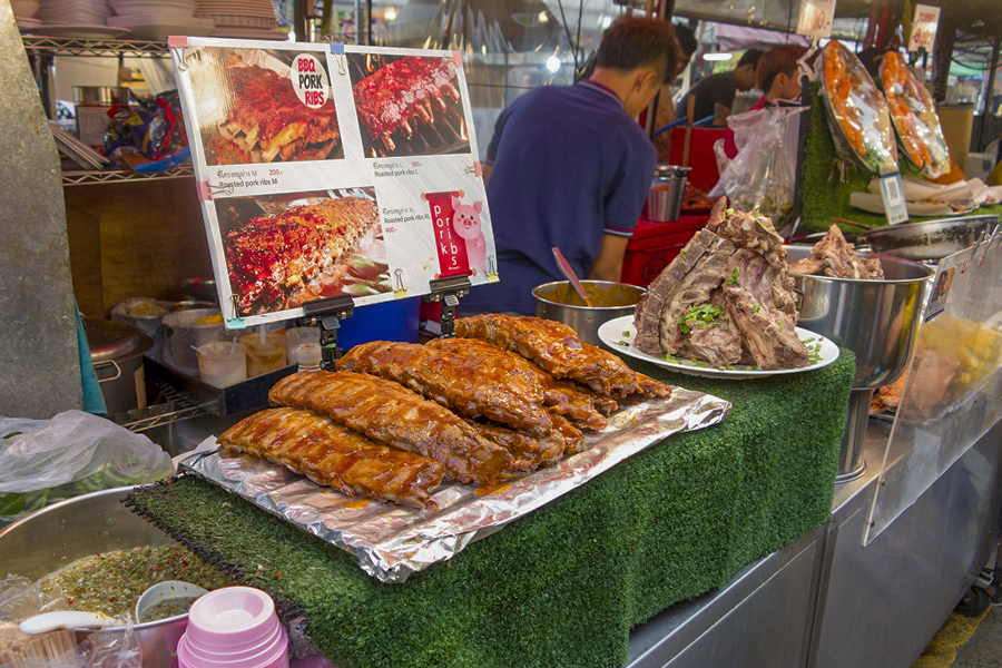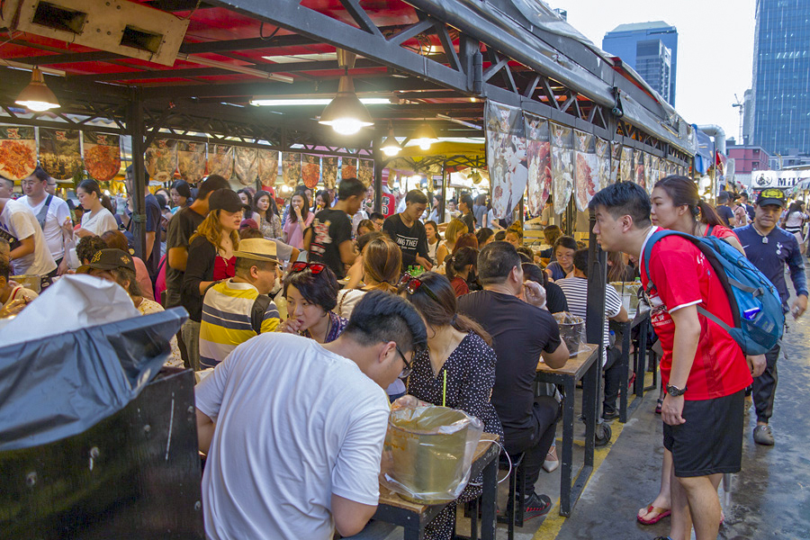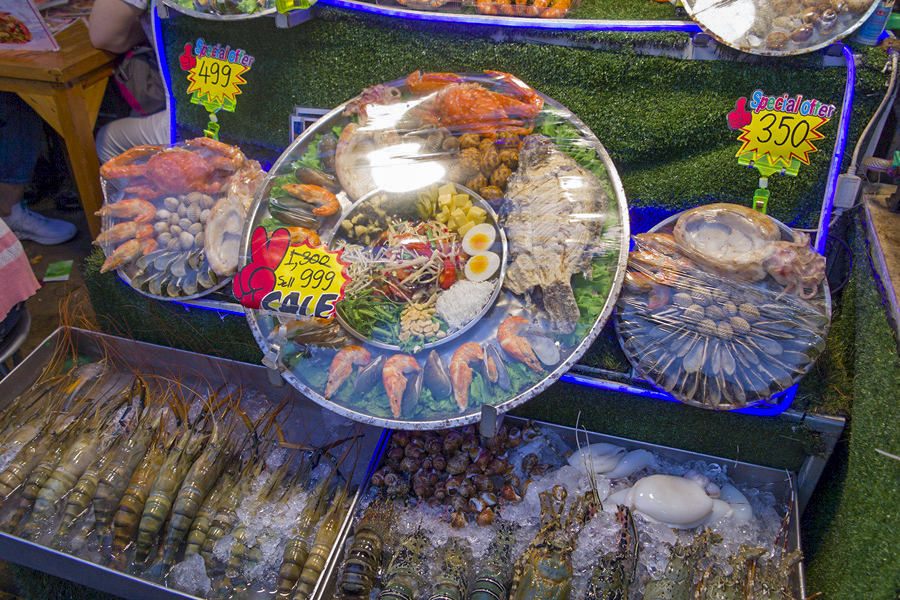 ![]() 拉差达火车夜市 这里七彩缤纷的帐棚如果从Esplanade停车场拍下来就会形成很震撼的高空夜景。贩卖食物,服装,饰品等的档口都以种类来规划,除此之外旁边还有些酒吧和餐厅。我们对这里的食物最感兴趣,但是很多档口都贩卖同样的小吃,让我们难于抉择。这里的海鲜拼盘,火山排骨,手抓海鲜等最受游客欢迎。