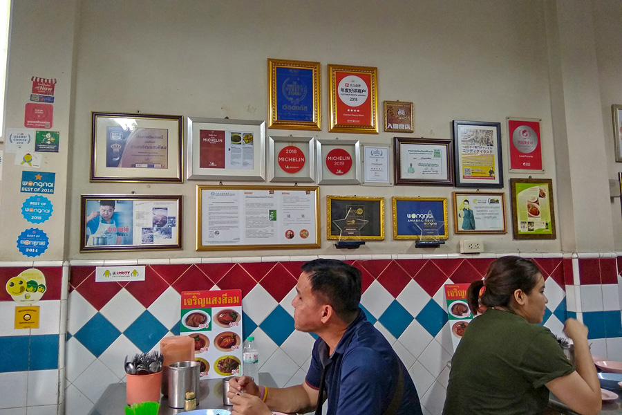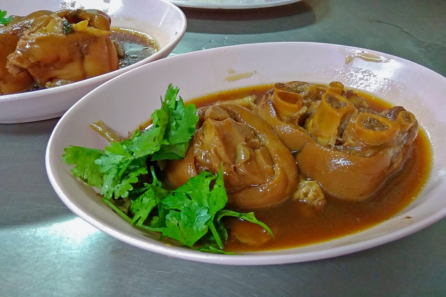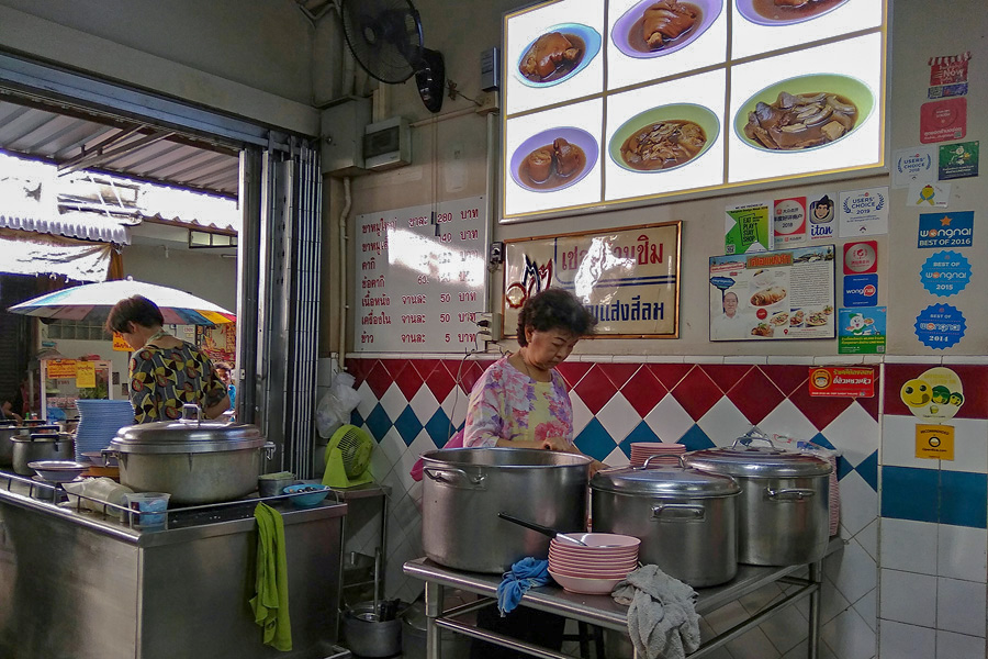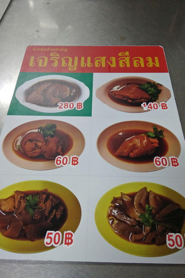 ![]() Charoen Saeng Silom猪脚饭 ![]() 老板娘正准备美食 ![]() 荣获各大饮食指南推荐 我们通过餐牌点了一份蹄膀和一份猪脚。卤得入味的蹄膀和猪脚,点上特制酸辣辣椒酱,再加上白饭真是绝配。难怪这里一直以来都屹立不倒,深获当地人和游客的芳心。