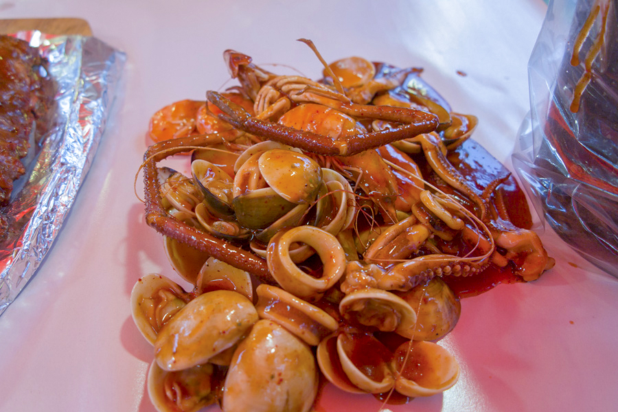 ![]() BBQ Pork Ribs ![]() 昆虫大餐 ![]() 传统泰式小煎饼-kanon bueng ![]() 不同种类的海鲜拼盘 ![]() 各类的烧猪肉 巡视了一轮食物摊位后,我们选择在由一班年轻人经营的Kung Thep吃手抓海鲜。我们叫了一份手抓海鲜和泰式烤猪排。服务员首先会把白餐纸铺在桌子上,然后递上塑胶手套,就等待食物上桌。首先上桌的是泰式烤猪排,过后服务员就拿出一个铁桶,里头装的就是海鲜。海鲜将会倒在白餐纸上,铁桶就留下装垃圾。海鲜有花枝,虾,蛤蜊,青耗等配上特制酱料,十分好吃。唯一不足的是这里的用餐空间太窄了,身体略大和带小孩的人会很不舒服。